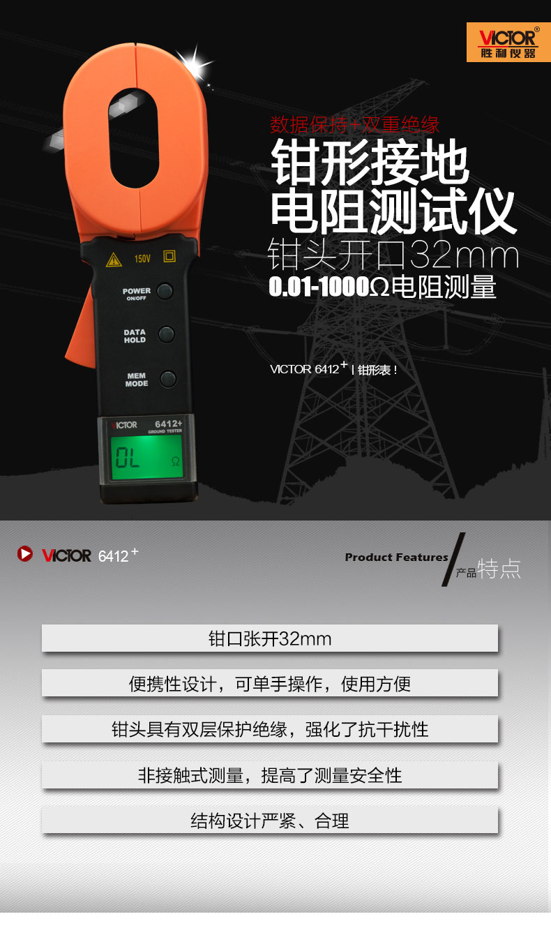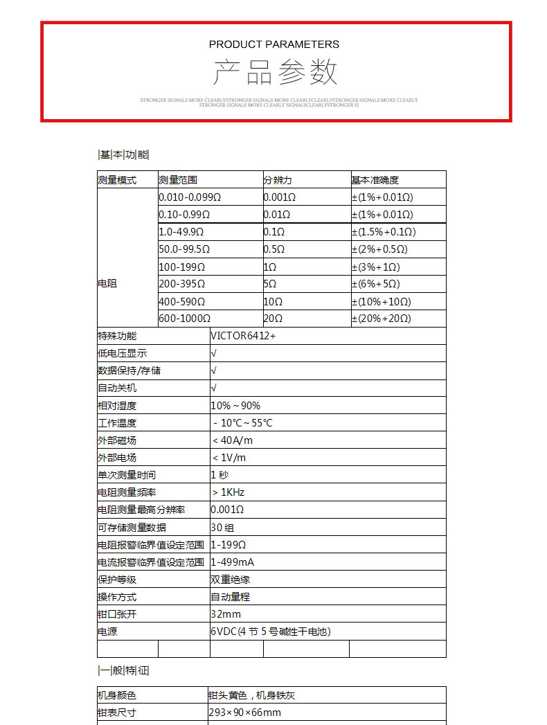简介:操作方式:自动量程产品名称:接地电阻测试仪VICTOR 6412+ 显示位数:3 1 2位|基|本|功|能|测量模式测量范围
