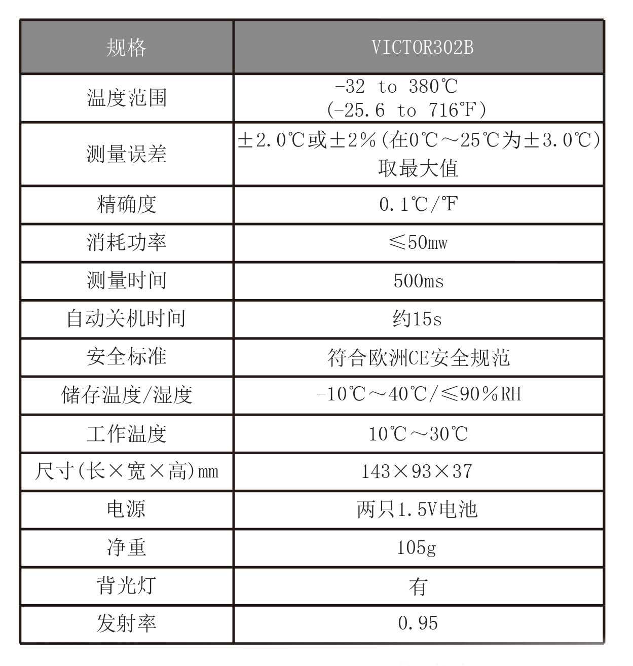 产品型号:VICTOR 302B 操作方式:手持式产品名称:红外线测温仪