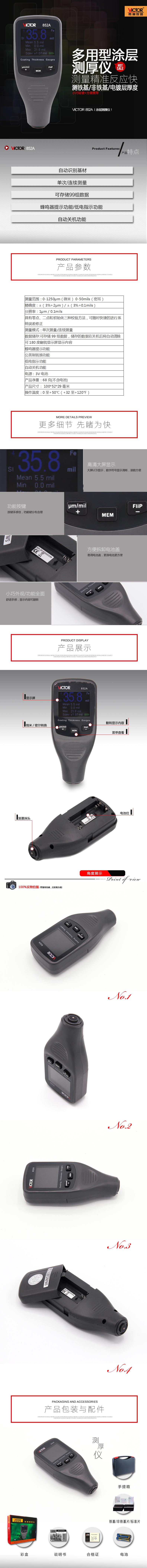 简介:操作方式:手动量程产品名称:涂层测厚仪 VICTOR 852A 显示位数:3 1 2位详细介绍:测量范围:0-1250μm