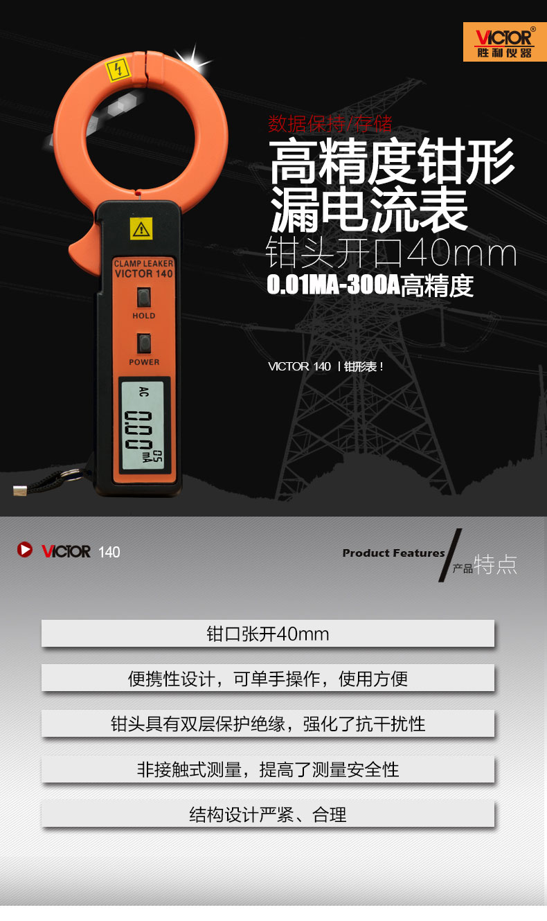 产品型号:VICTOR 140 操作方式:产品名称:钳形漏电流表VICTOR 140 ,VICTOR 140高精度钳形漏电流表是专为测量