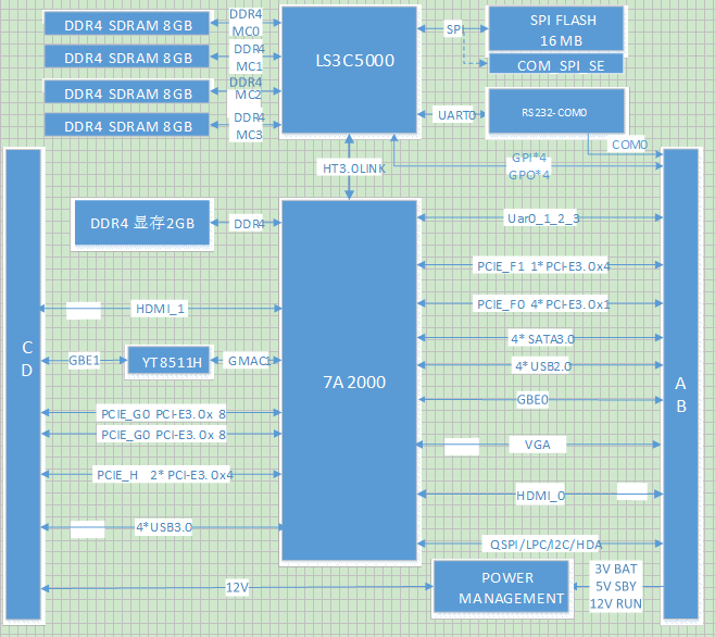SMLS_3C7A_A模块参照PICMG COM Express Module Base Specification Reversion 2.0 Type 7 Extended Modules进行设计。CPU采用龙芯高性能服务器十六核处理器LS3C5000, 默认主频2.0GHz;搭载龙芯新一代桥片7A2000, 集成高性能GPU显示功能; 标配板载32GB DDR4内存,支持ECC功能。 模块支持2路千兆网络、4路USB2.0、4路USB3.0、6路串口、4路SATA3.0等I/O扩展;PCIE标配支持2路PCIE3.0x8,3路PCIE3.0x4,4路PCIE2.0x1,4路PCIE时钟输出;显示接口支持1路HDMI0+VGA同显、1路HDMI。