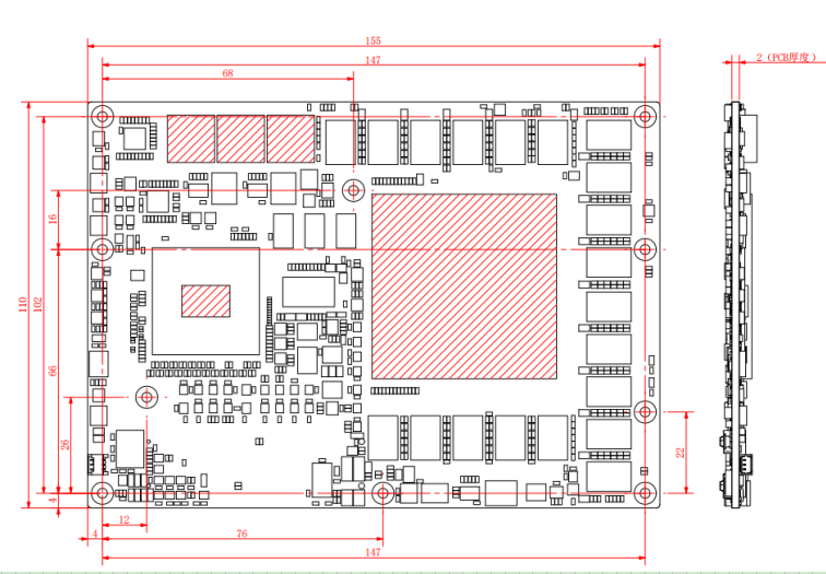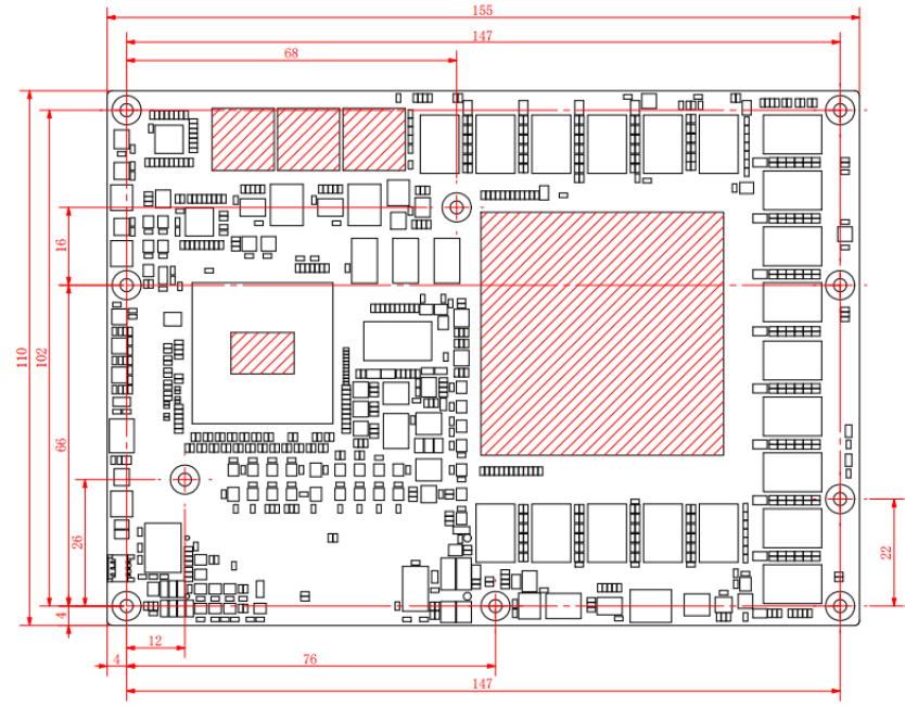 模块功耗较高,需要散热器进行主动散热,接触导热器件位置如下图2-4示:
