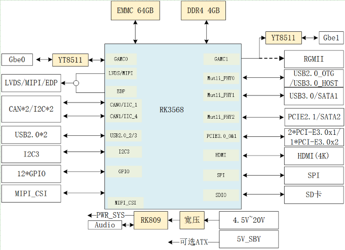 模块具有丰富的IO接口:默认支持2路自适应千兆网口,其中1路千兆网口可选为RGMII接口,1路音频接口,1路SPI接口,1路I2C接口,2路USB3.0_HOST (HOST0可选1路OTG,HOST1可选1路SATA3.0),2路USB2.0_HOST,2路CAN2.0,1路PCI-E2.1,2路PCI-E3.0(可选1路PCI-E3.0X2),集成标准的音频输入输出信号,4路TTL串口,12路GPIO,2路PWM。