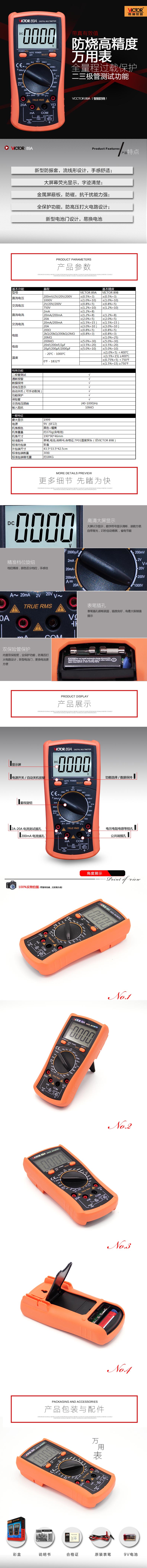 简介:操作方式:手动量程产品名称:数字万用表VICTOR 89A显示位数:3 1 2位特点:1防振套流线形设计手感舒适