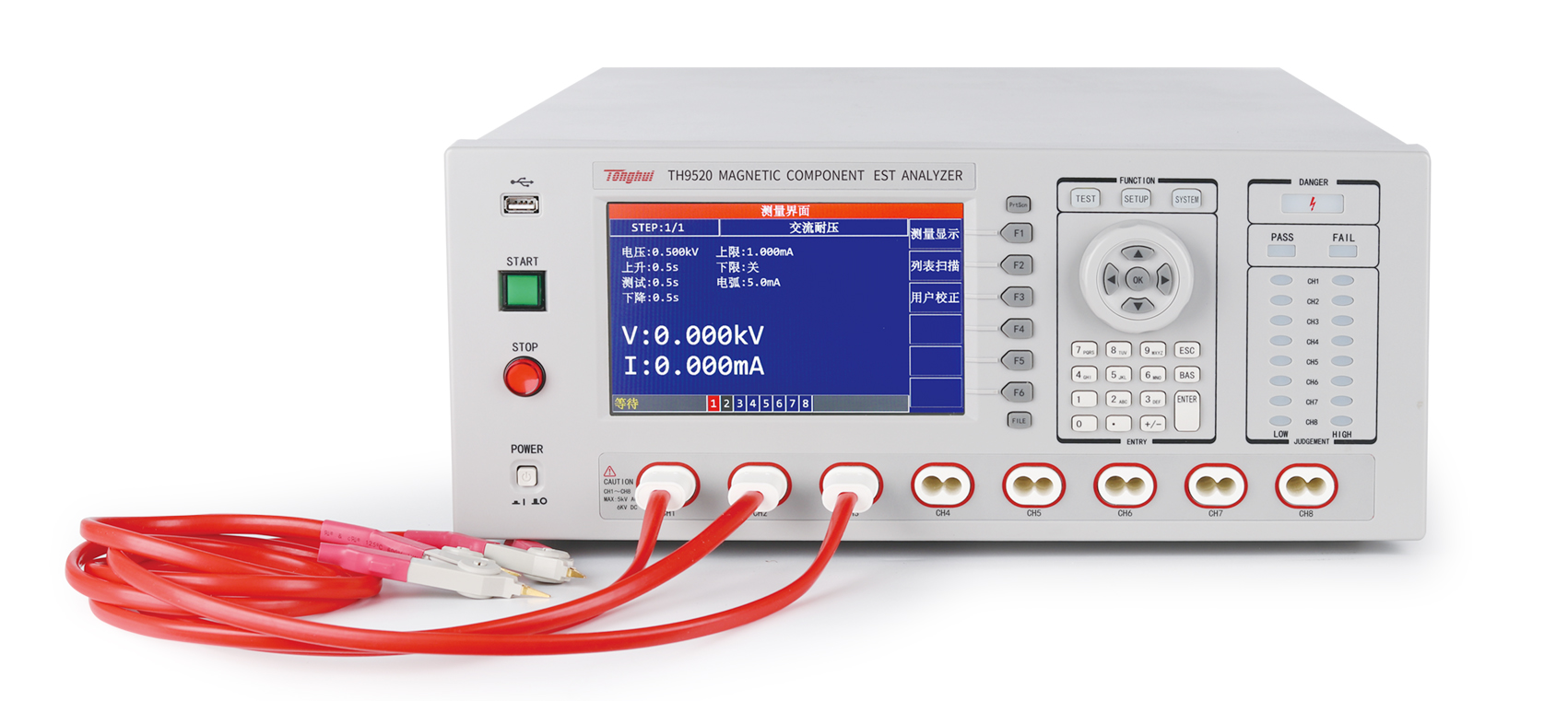 Introduction:TH9520/A comprehensive analysis system in a single machine to achieve AC voltage withstand, DC voltage withstand, insulation resistance, turn to turn insulation test, DC low resistance, inductance (TH9520A optional) test six functions. For coil components required test items such as safety and voltage resistance, interturn insulation, winding resistance value, coil inductance (TH9520A optional), before the need for four different instruments respectively for testing, now can be realized in a single machine